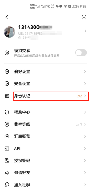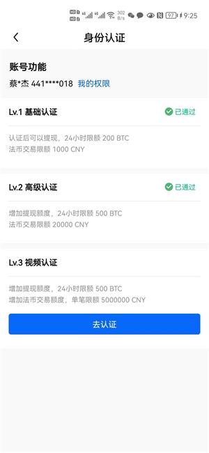 2、下载安装好后进行实名认证,进行lv2高级认证