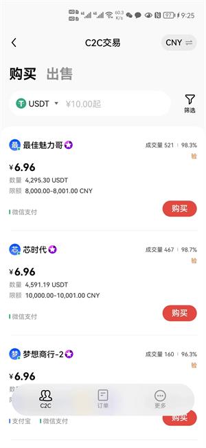 3、进行c2c买币,输入想买的金额和选择支付渠道,1Usdt=6.96元rmb