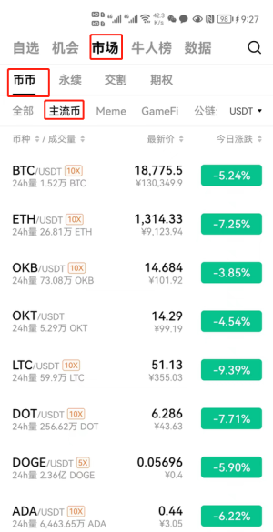 在市场选择币币交易选择主流币,选择主流币下面看好的币交易即可